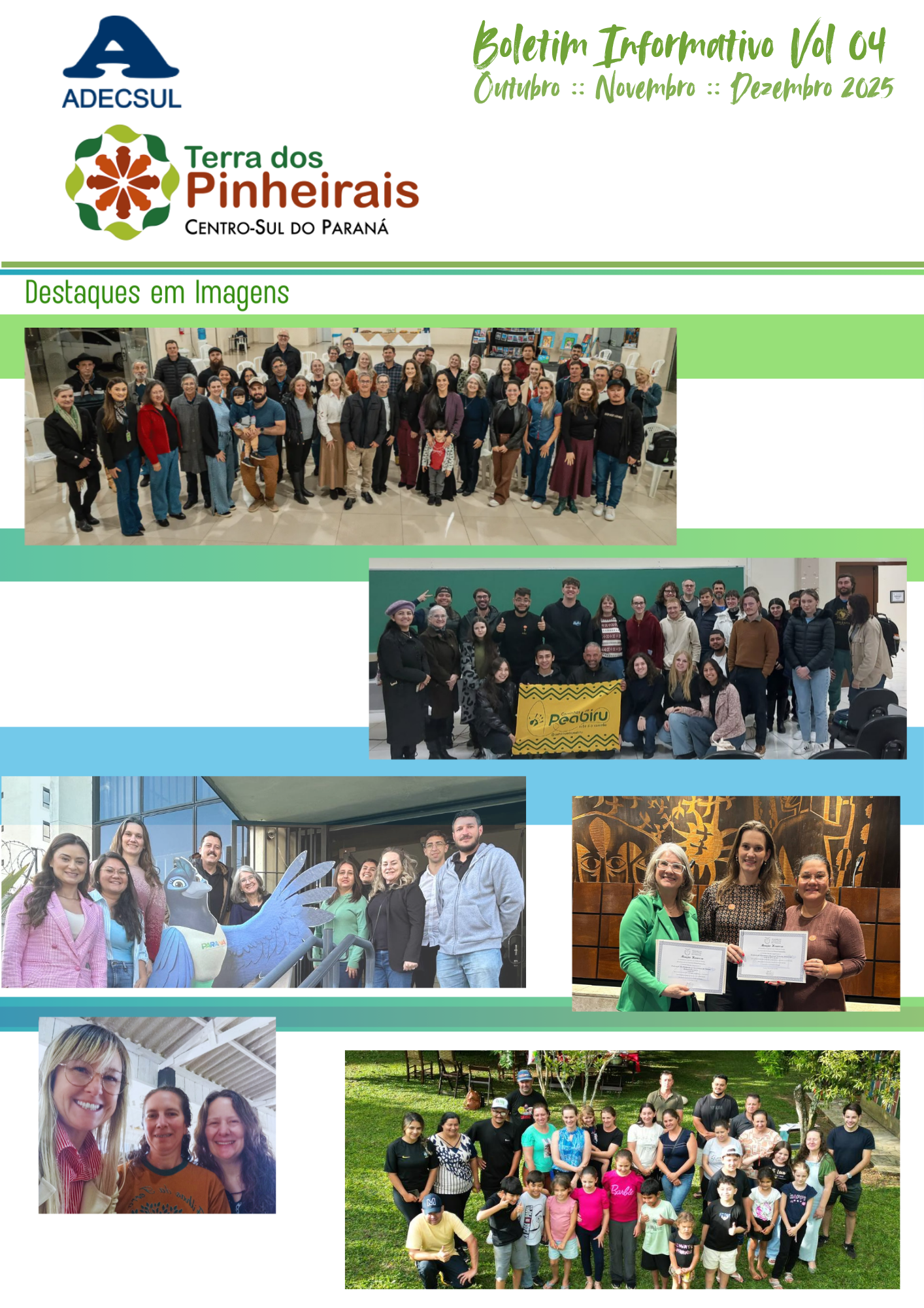 Neste início do novo ano de 2026 apresentamos nossas atividades e informações valiosas o desenvolvimento do Turismo Regional. Entre elas destacamos as conclusões e propostas do GT de Turismo Rural e as próximos encaminhamentos do Programa da Rota Turística dos Caminhos do Peabiru. Um trimestre de muita integração regional e valorização do trabalho e dedicação da Adecsul - IGR Terra dos Pinheirais.