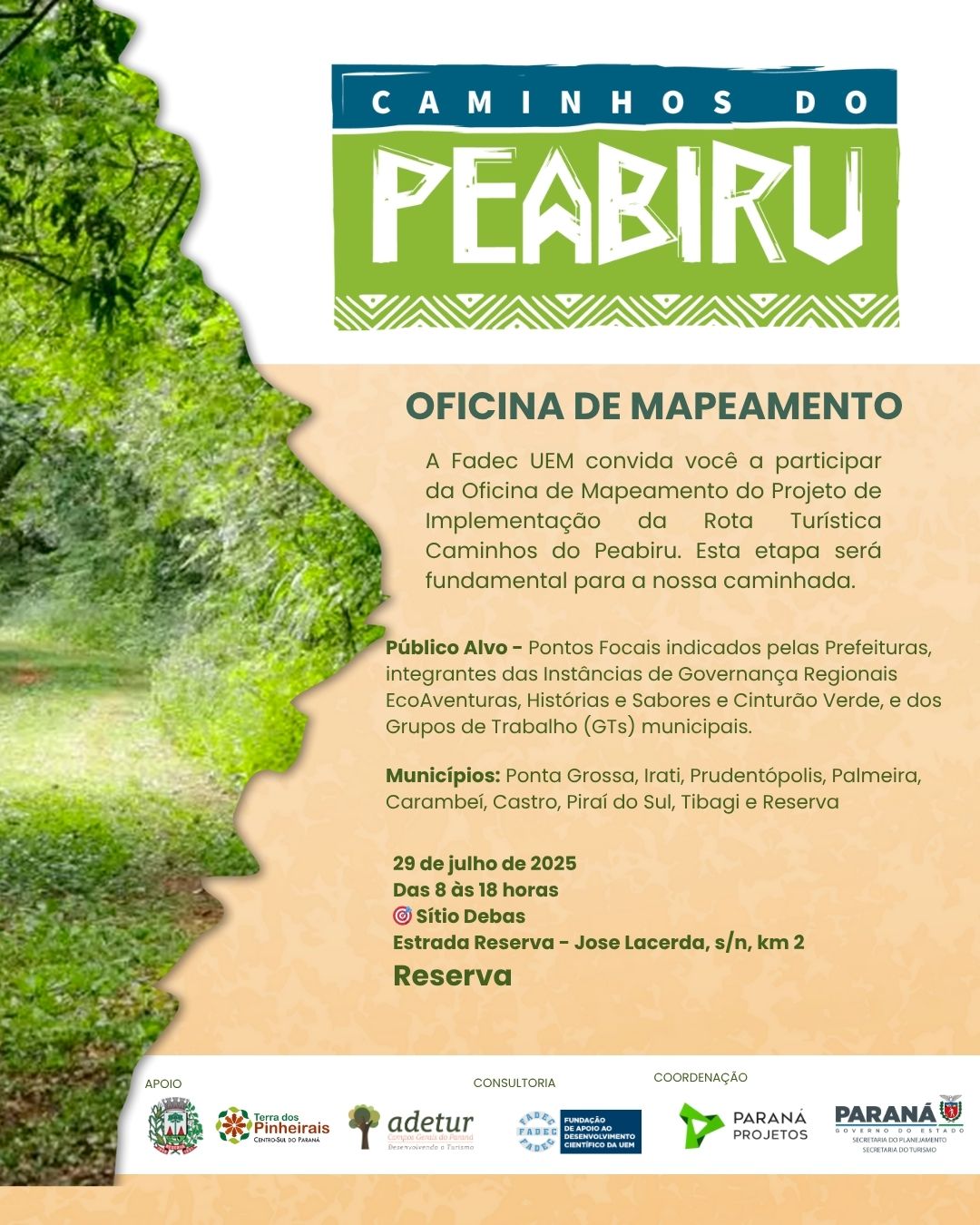 29/07/2025 - Foi realizada a Oficina de Mapeamento do Caminhos do Peabiru em Reserva - PR, o Grupo de Trabalho do município de Irati esteve presente durante o encontro, juntamente com outros municípios. A oficina contou com duas etapas, sendo a primeira com a parte teórica, aplicando o conhecimento sobre o projeto, a segunda parte contou com a parte prática, o mapeamento, com mapas fisicos de cada municipio para que os grupos de trabalhos pudessem elaborar o caminho.