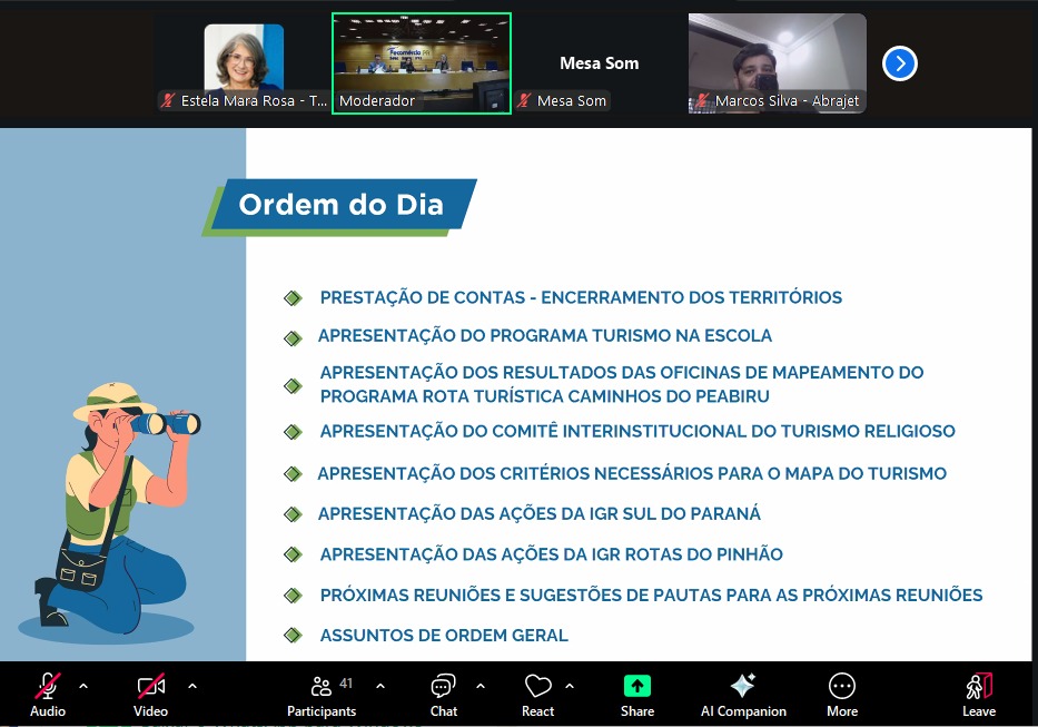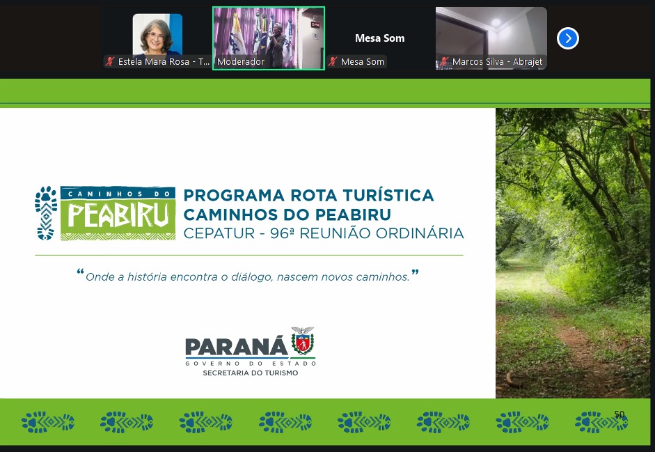 03/09/2025 - A reunião híbrida do Cepatur apresentou a prestação de contas e o encerramento dos territórios, além do Programa Turismo na Escola e dos resultados das oficinas de mapeamento da Rota Turística Caminhos do Peabiru. Também houve a apresentação do Comitê Interinstitucional do Turismo Religioso e dos critérios necessários para a inclusão no Mapa do Turismo. O encontro ainda abordou a definição de pautas para as próximas reuniões e o debate de assuntos gerais.