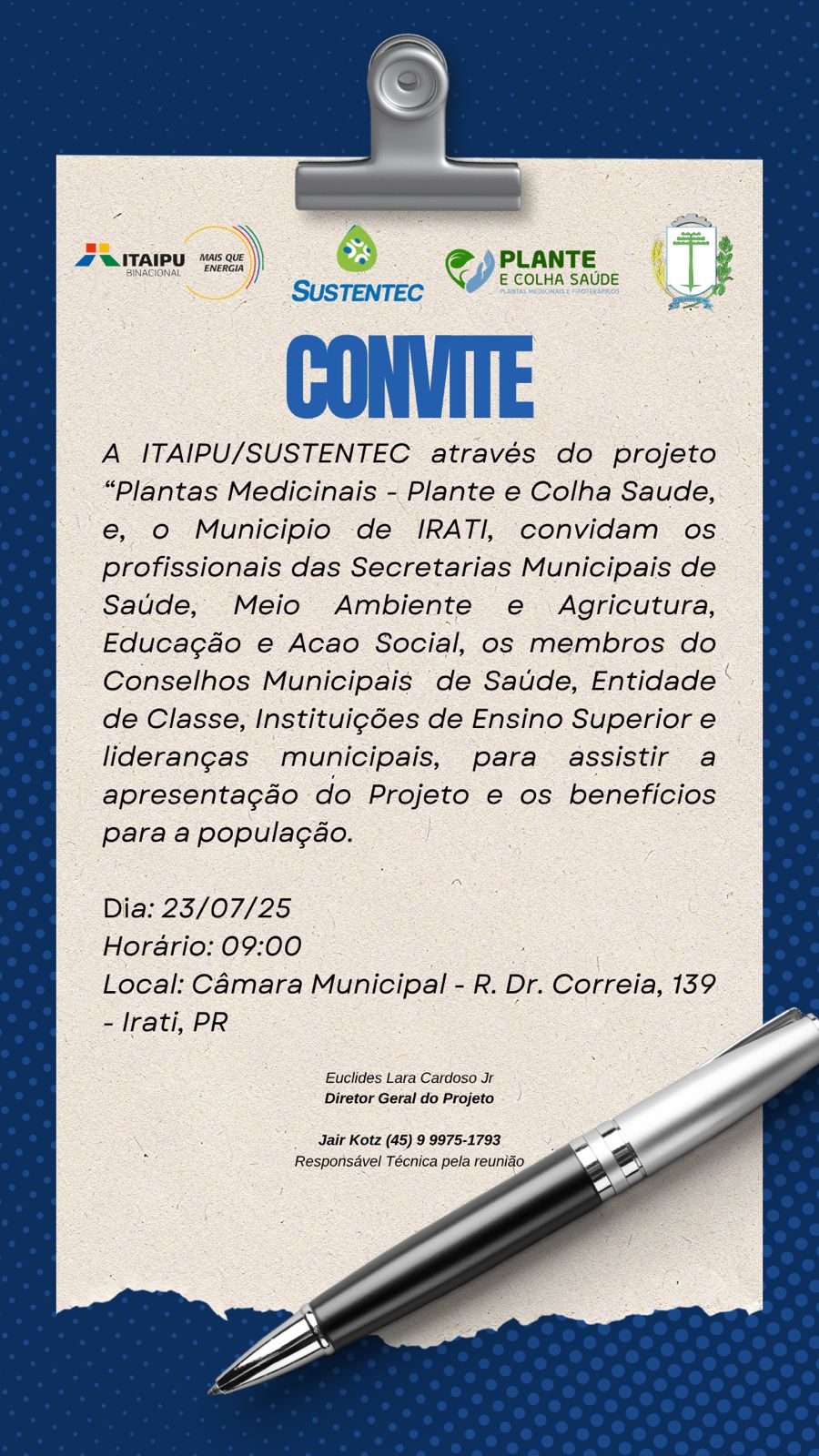 23/07/2025 - Reunião realizada no município de Irati para apresentação do Projeto "Plantas Medicinais - Plante e Colha Saúde", sendo dirigido pelo Diretor Geral do Projeto Euclides Lara Cardoso Jr. e palestrado por Jair Kotz com o intuito de expor os benefícios para a população.